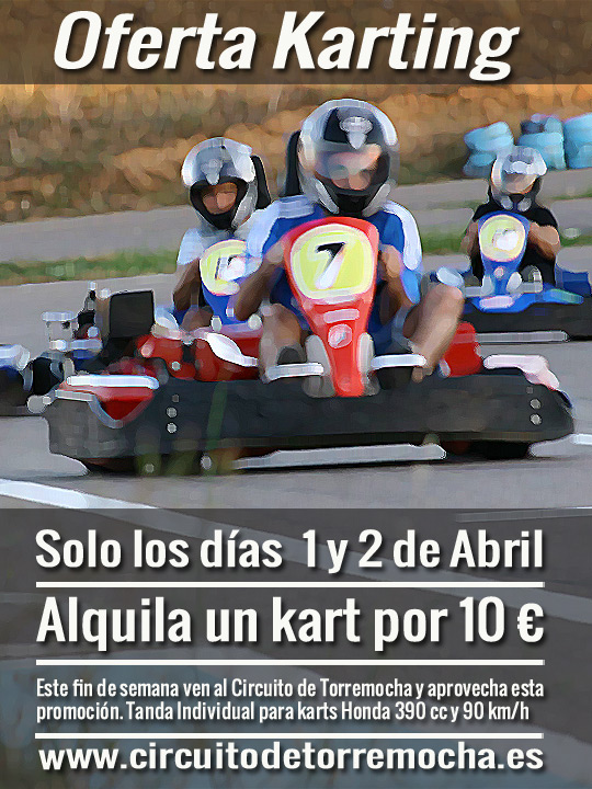 Súper Oferta Alquiler de Karts. 10€ solo los días 1 y 2 de Abril Posted on 31 marzo, 2017 by thkarts Spread the loveEste fin de semana iniciamos la primavera con una súper oferta para que puedas disfrutar de nuestros potentes karts honda 390 cc. Recuerda ¡¡¡¡¡ SOLO ESTE FIN DE SEMANA!!!1